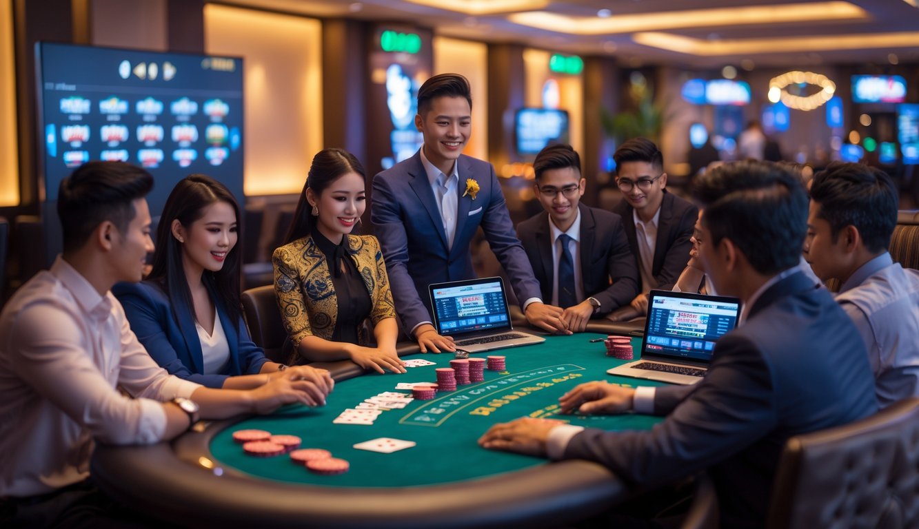 Seorang dealer blackjack profesional melayani pemain yang bermain blackjack secara online di lingkungan kasino modern dengan suasana hangat dan dekorasi khas Indonesia.