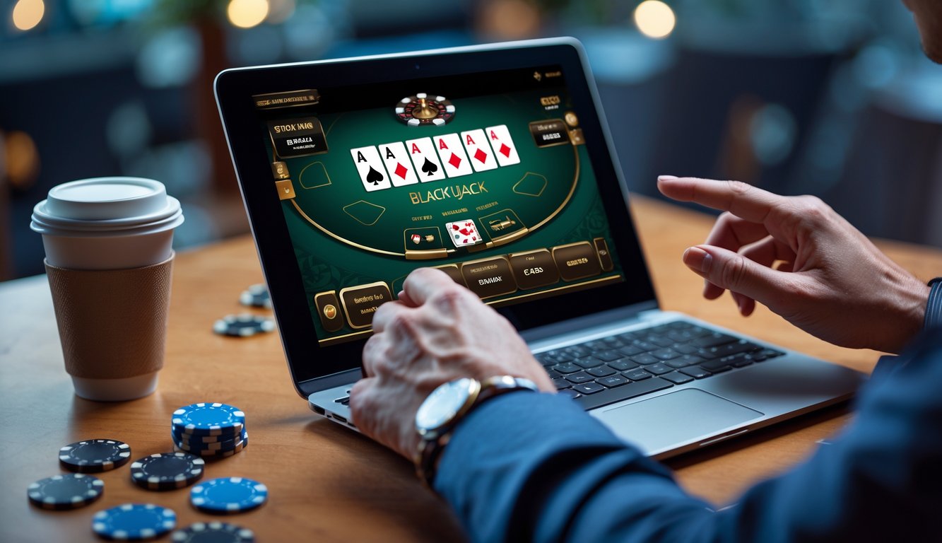 Seseorang bermain blackjack online menggunakan laptop di atas meja dengan chip poker dan cangkir kopi.